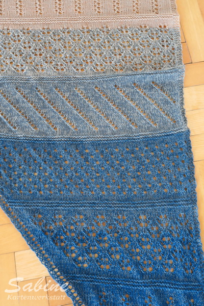 Das Tuch ist symmetrisch, das folgende Bild täuscht da sehr, gestrickt habe ich von blau zu beige.